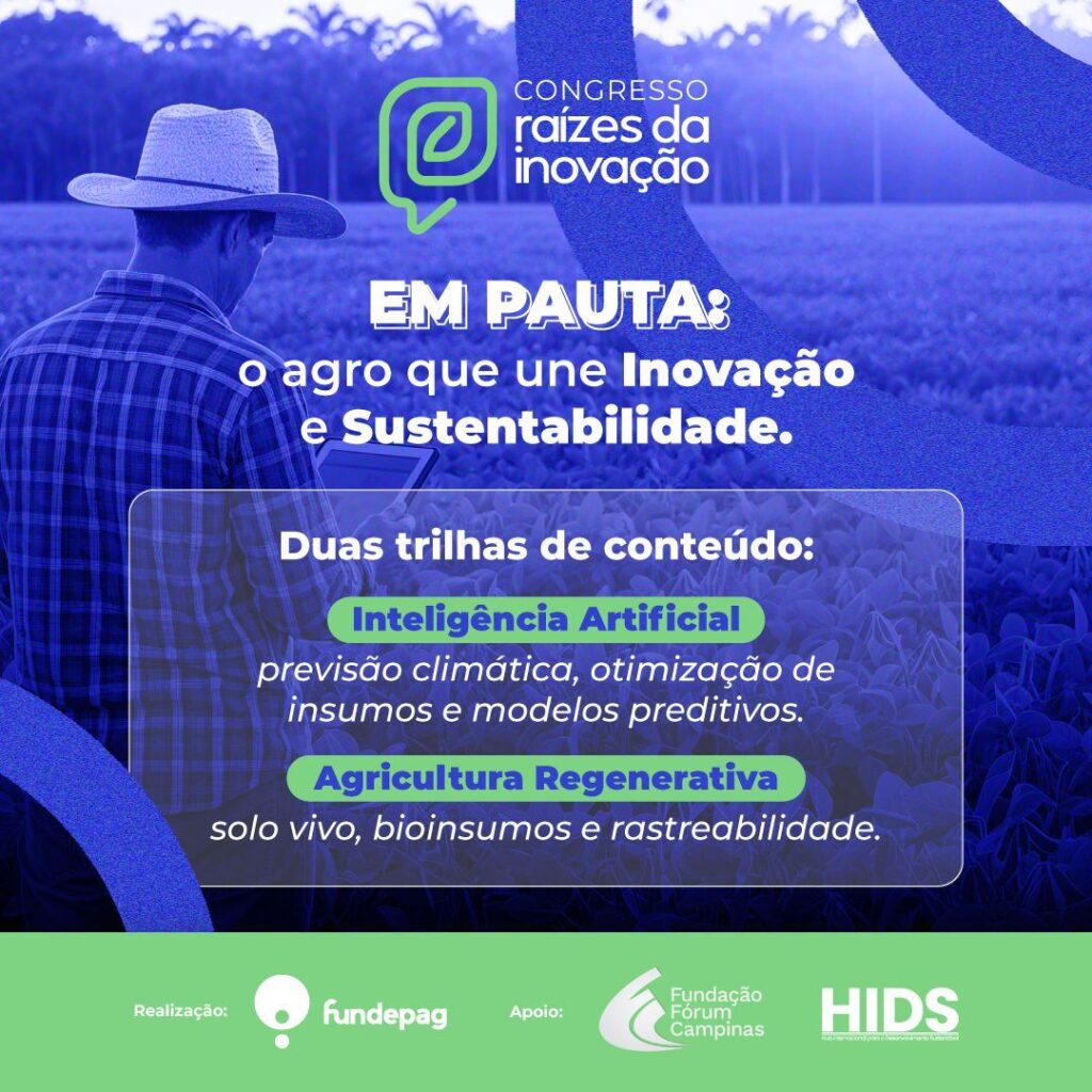 A Fundação de Desenvolvimento da Pesquisa do Agronegócio promove, nos dias dois e três de dezembro, o Congresso Raízes da Inovação, no Expo Dom Pedro, em Campinas. O encontro reunirá representantes de empresas, indústrias, fundos de investimento, instituições de ciência e tecnologia, universidades, organizações multilaterais e gestores governamentais.