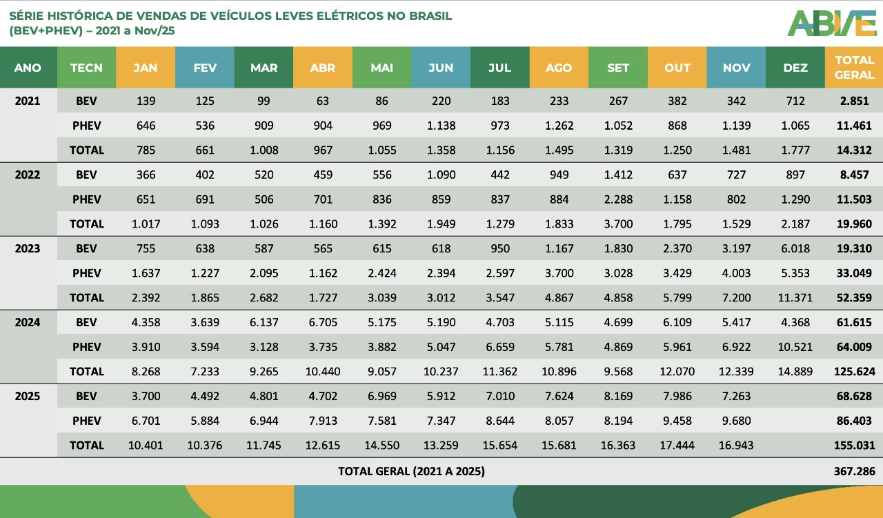 Os veículos plug-in seguem dominantes, com 79,9% das vendas (16.943 unidades). Os híbridos plug-in (PHEV) tiveram aumento de 2,4% sobre outubro e continuam líderes. Os modelos 100% elétricos (BEV) somaram 7.263 unidades, com retração mensal, mas alta de 34,1% em um ano.