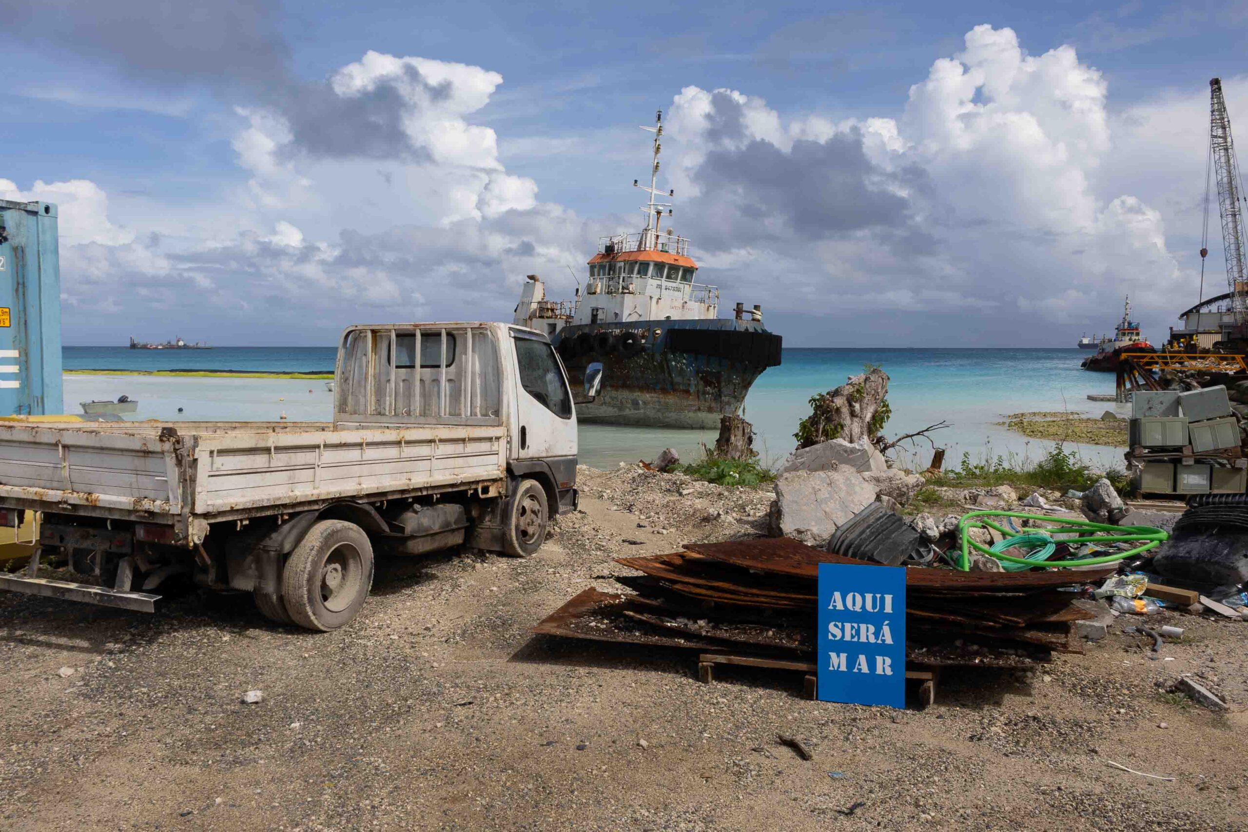 A exposição reúne trabalhos de duas séries produzidas em Tuvalu. Em Aqui Será Mar, o artista apresenta fotografias realizadas no atol de Funafuti, onde vive a maior parte da população do país. As imagens mostram uma placa azul com a inscrição “Aqui será mar” posicionada em locais emblemáticos, sempre sem a presença humana, criando uma sensação de abandono e antecipação do desaparecimento.